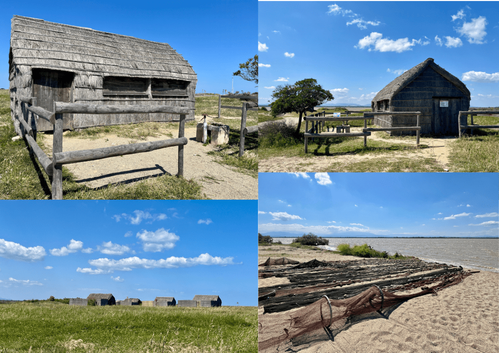 La pause déjeuner se fait au Village de Pêcheurs, à Canet-en-Roussillon, un ensemble de dix cabanes en bois traditionnelles, construites uniquement avec des matériaux locaux. Réhabilitées en 1993, ces structures servent aujourd’hui principalement de lieux de stockage pour le matériel de pêche, bien que certaines soient encore utilisées par les pêcheurs locaux pour leurs activités quotidiennes.