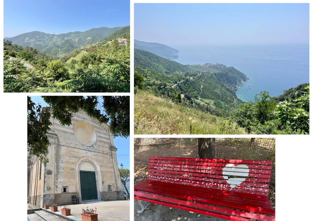 Le calme après la tempête, la Chiesa della Madonna di San Bernardino nous offre un peu de répit. Et un très beau panorama sur les villages de Corniglia et, au loin (si si), Manarola.