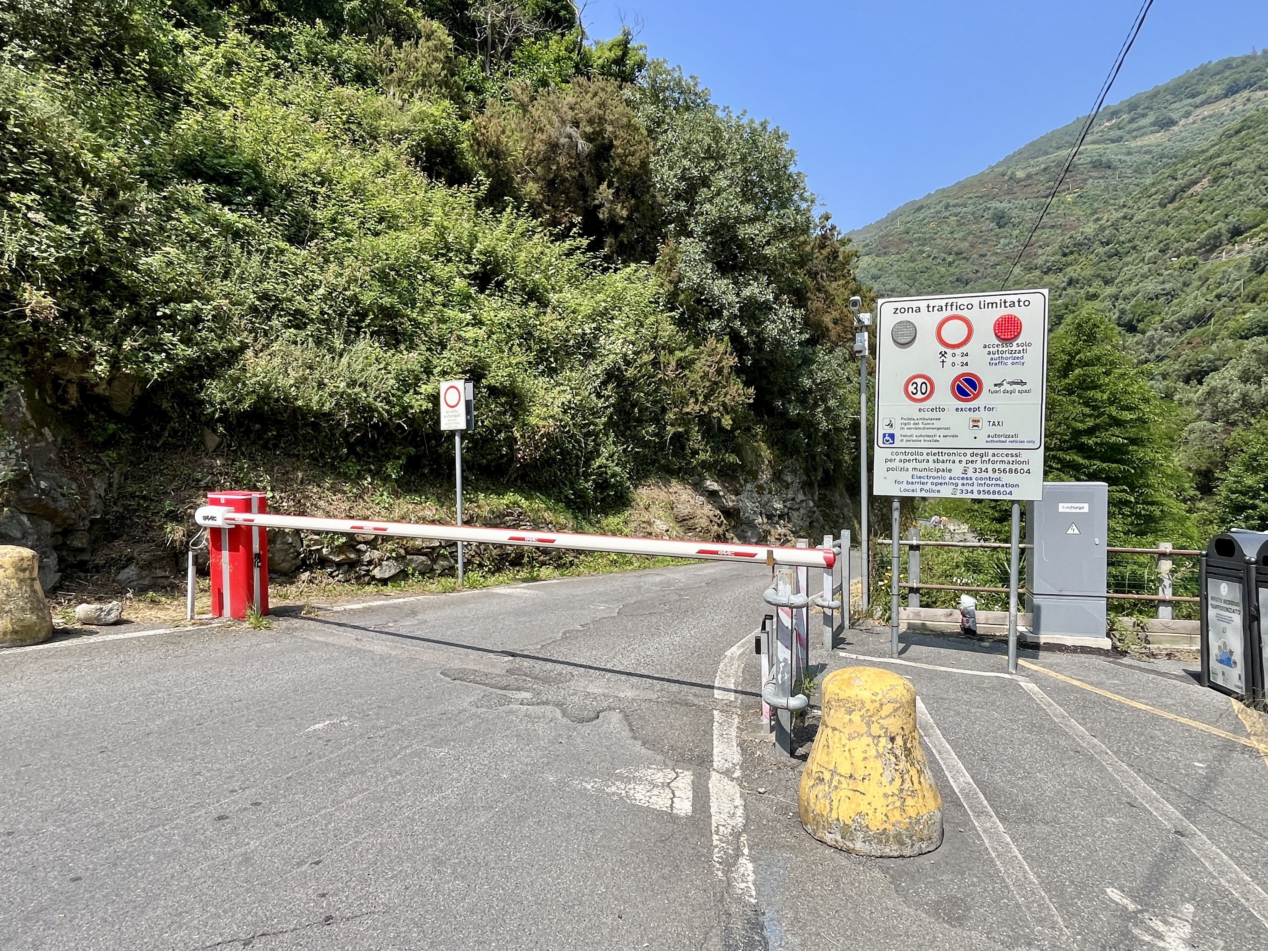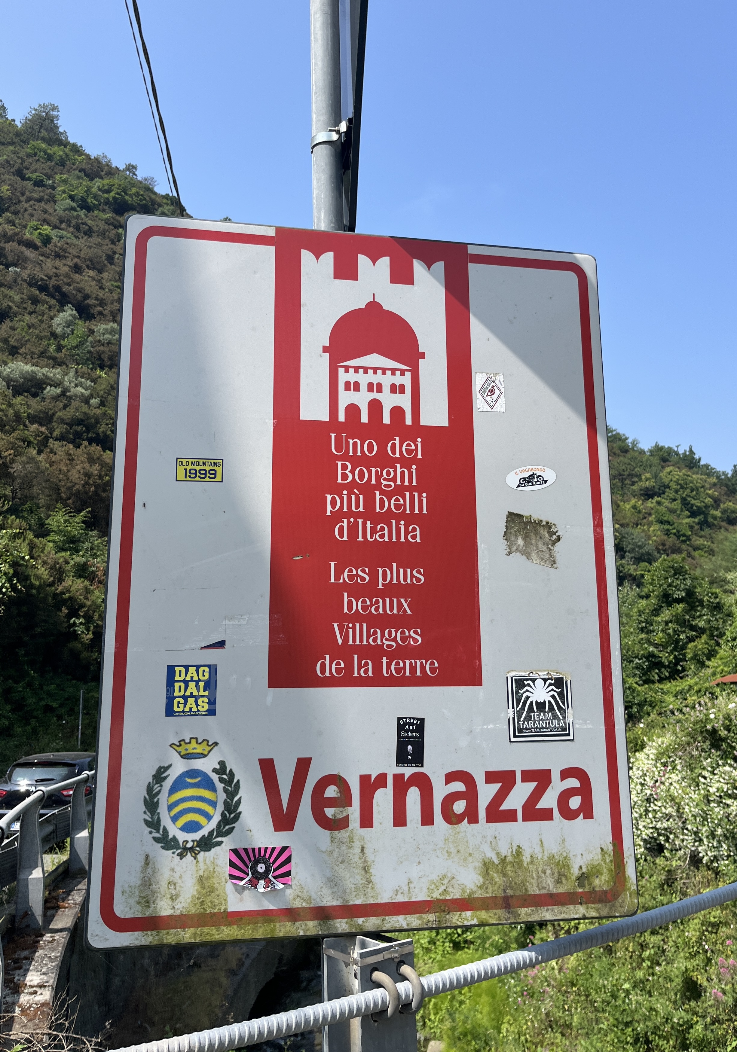 Bref, nous commençons donc avec Vernazza (considéré comme l’un des plus beaux). Ce qui frappe à l’arrivée, eh bien, c’est qu’on n’y rentre pas comme ça à Vernazza ! Non de non. Nous déjà, on a dû laisser le Doddy bien plus haut pour pouvoir accéder au village (n’empruntant ni un bateau, ni un train, ni les fameux pass rando). Pire qu’un fort, pire qu’une zone surveillée : ce ne sont pas moins qu’une barrière, des caméras et de moults avertissements qui accueillent les touristes aux abords de la ville (Zona a Traffico Limitato oblige, et attention à toi si tu n’y prends pas garde !).