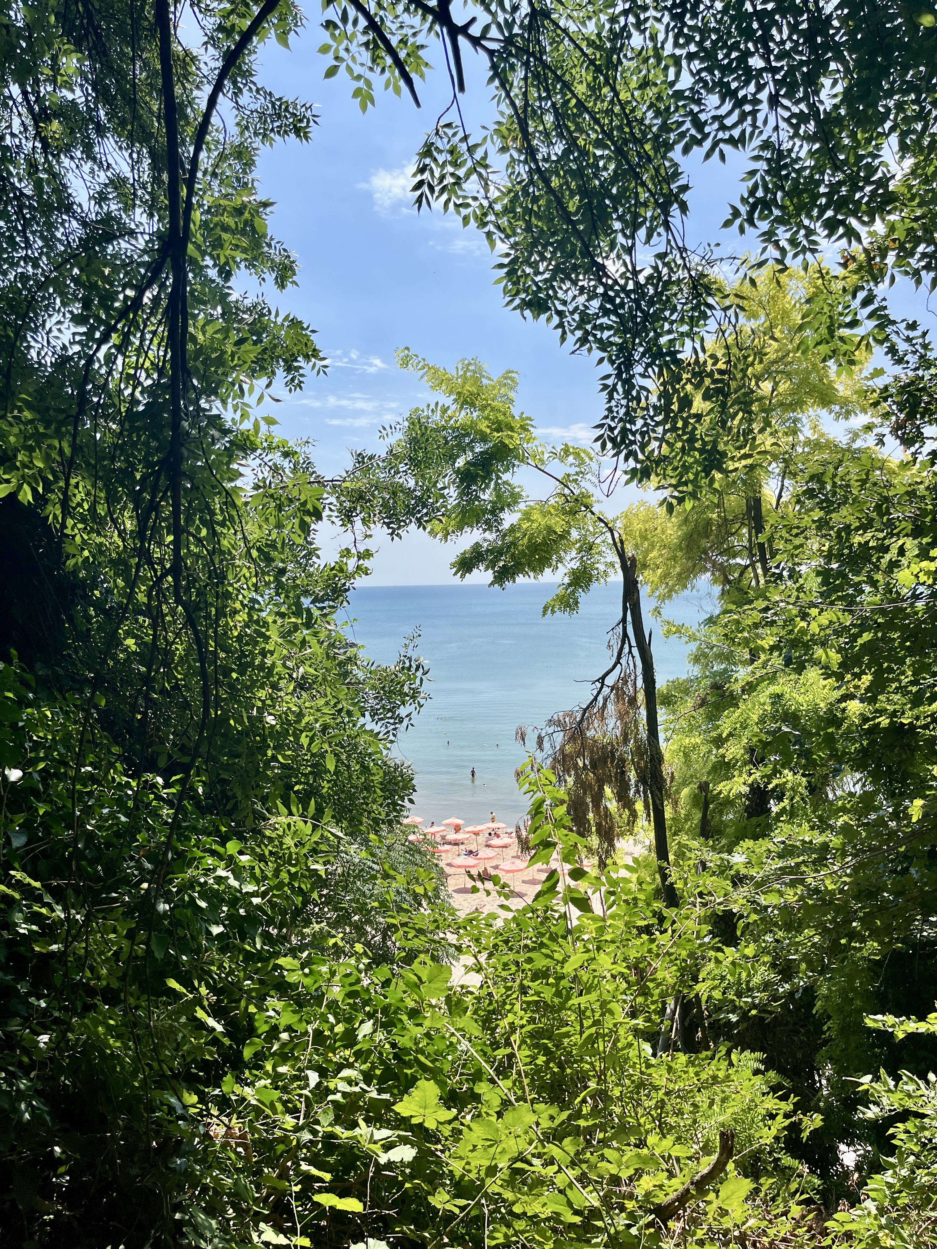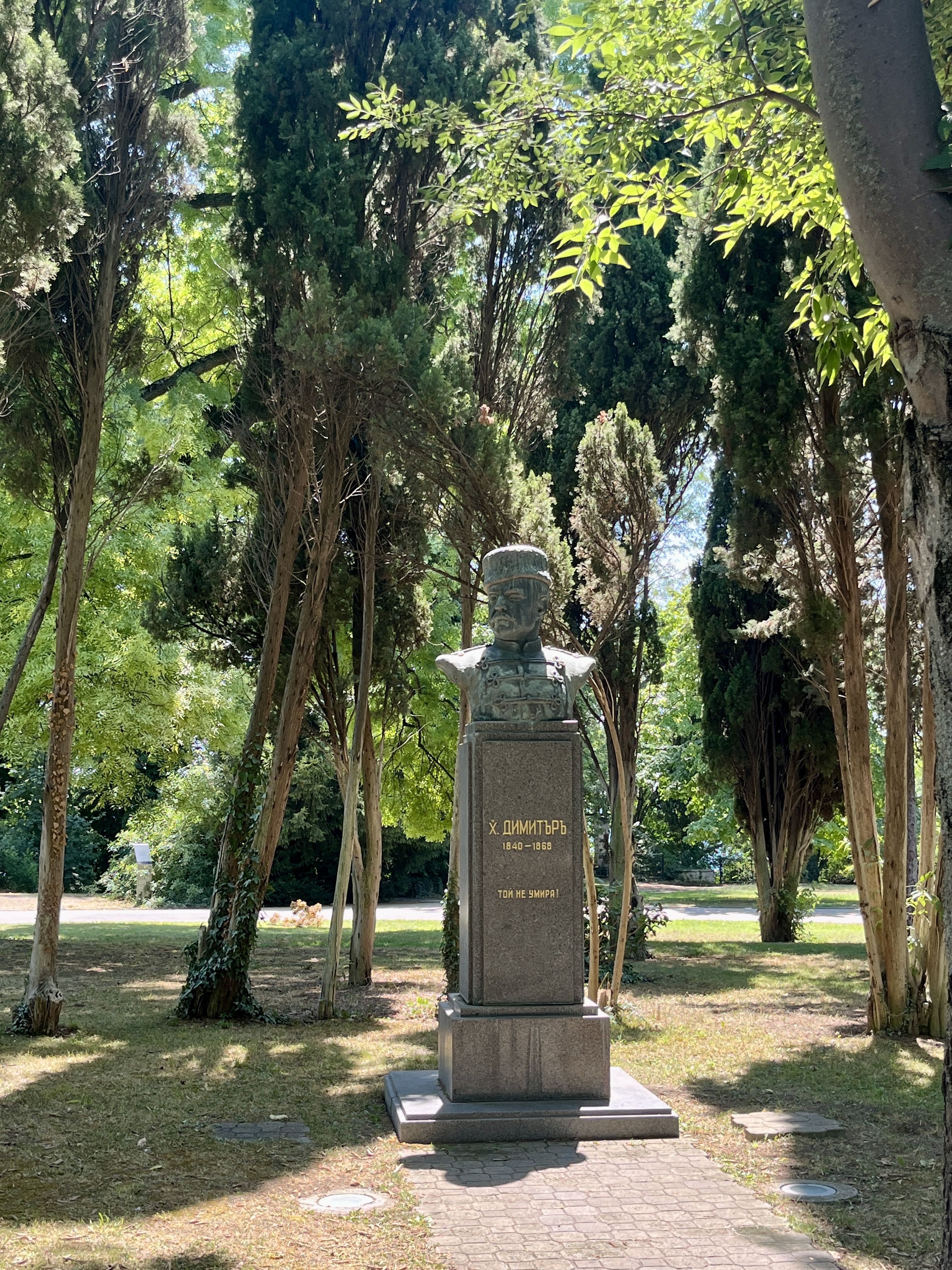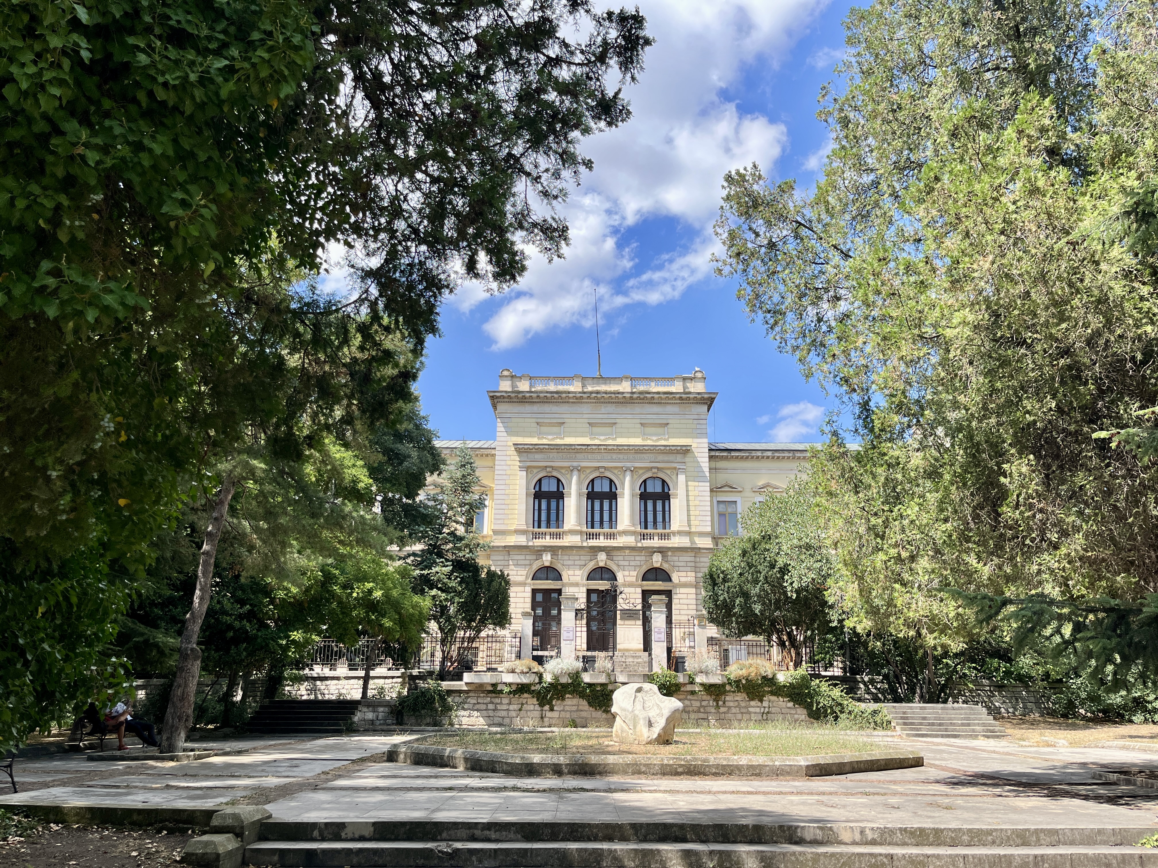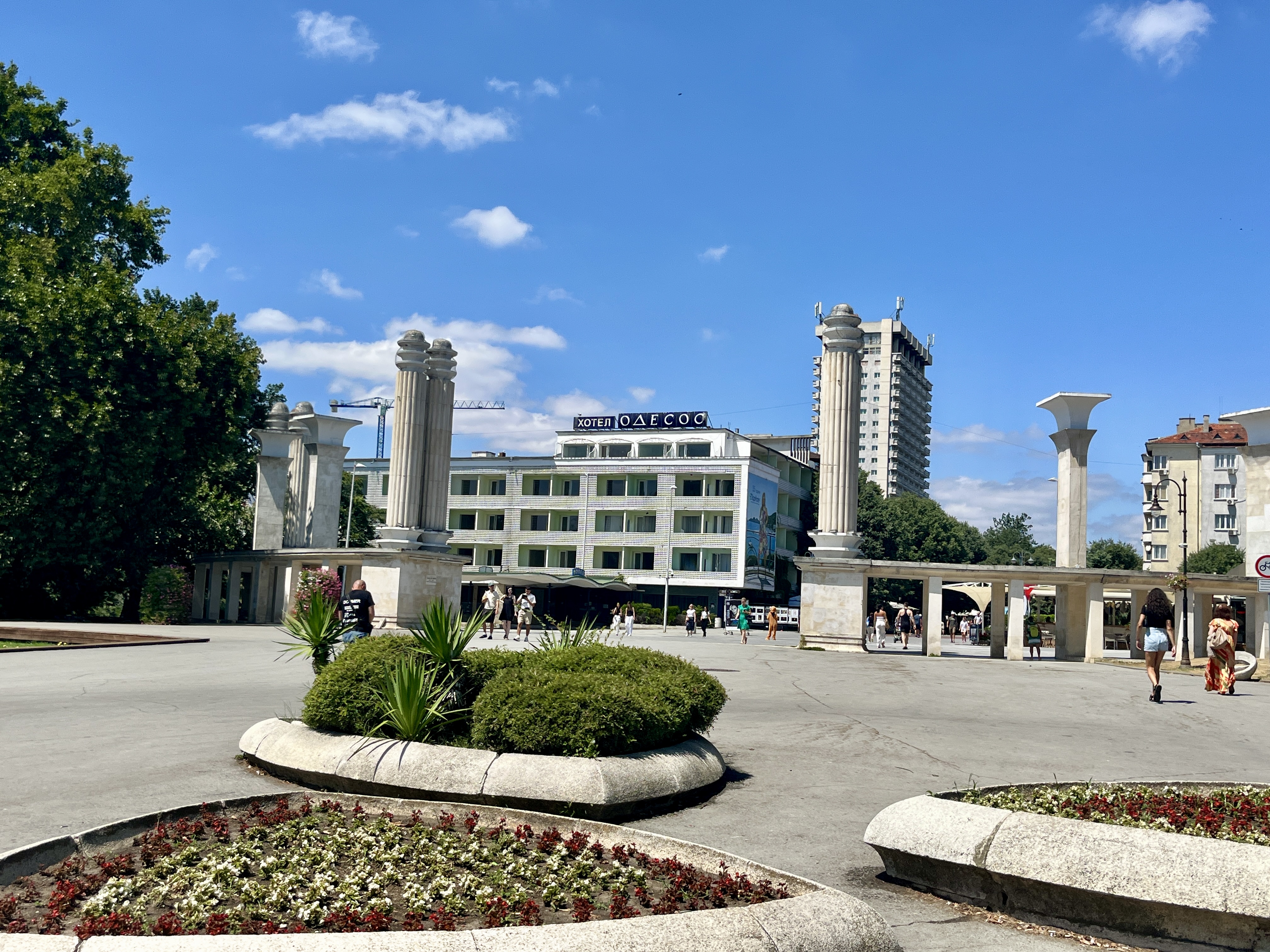 D’abord, c’est en longeant le bord de mer, où nous sommes stationnées, que nous atteignons le Sea Garden (Приморски парк), le poumon vert de Varna. Il s’étire entre la ville et la mer, comme une frontière douce, entre agitation urbaine et horizon marin. On y flâne allègrement, entre l’ombre des allées de pins et de palmiers, entourées de statues un peu kitsch, souvenirs soviétiques. La mer, toujours là en contrebas, se devine entre les feuillages, qui commencent déjà, par endroits, à revêtir les couleurs de l’automne.