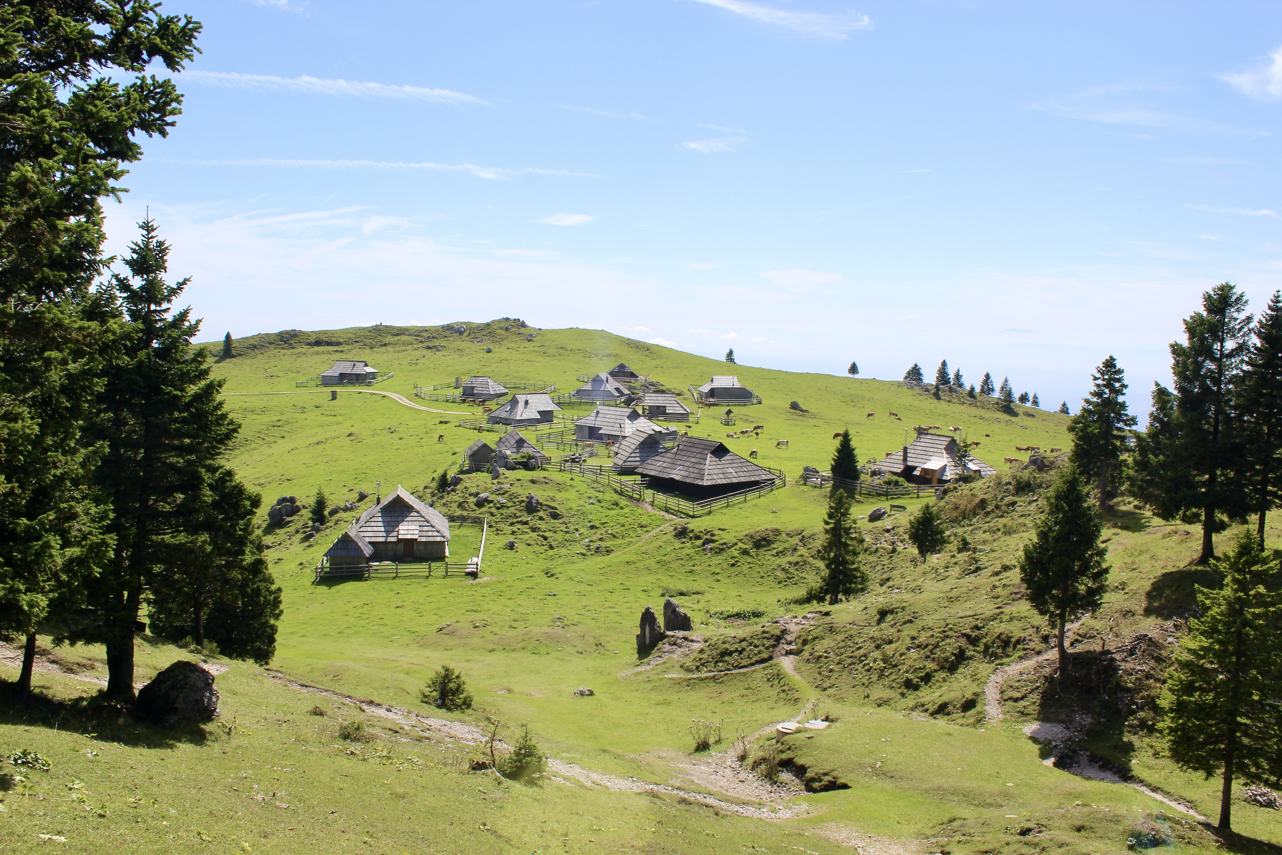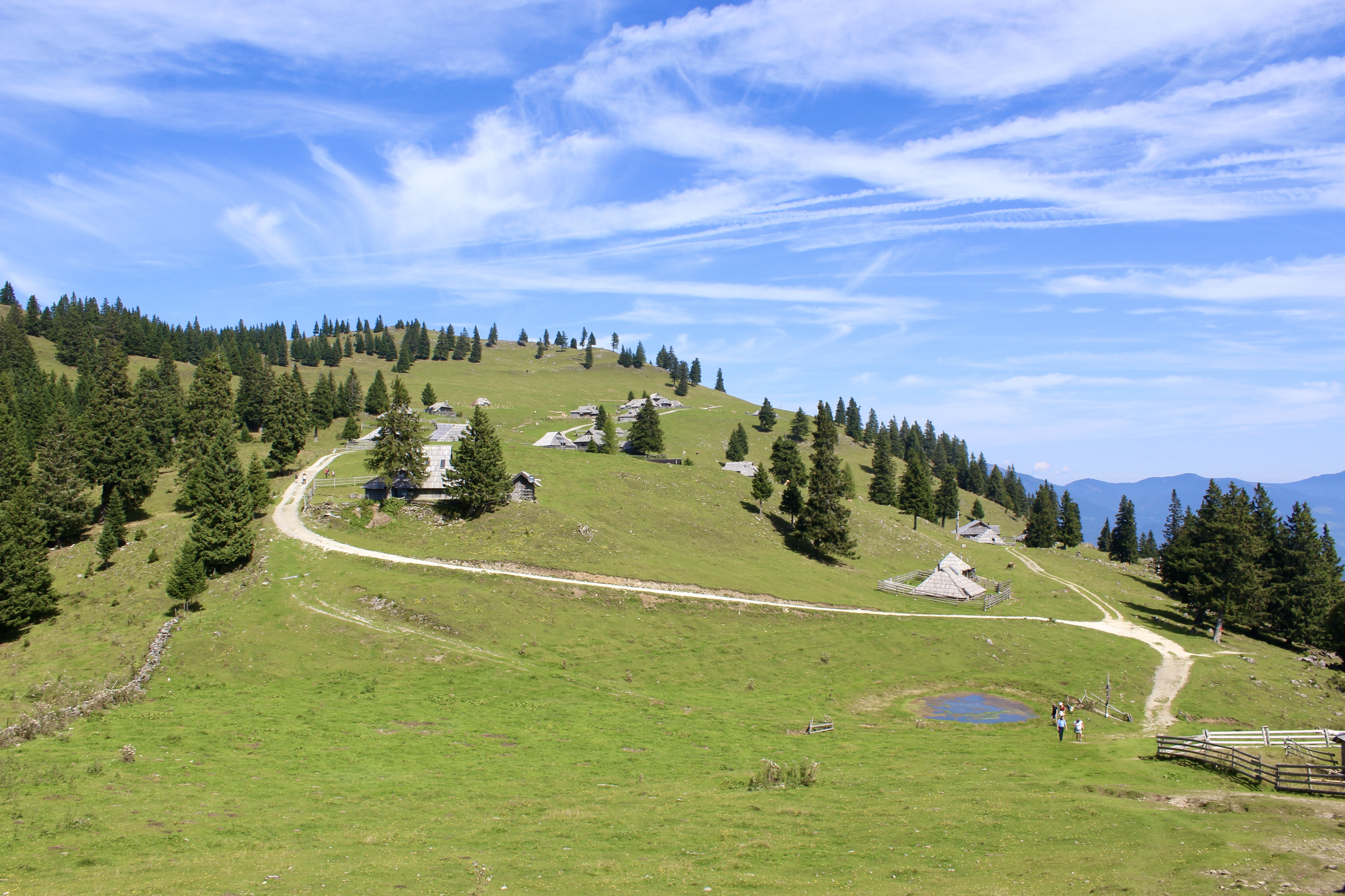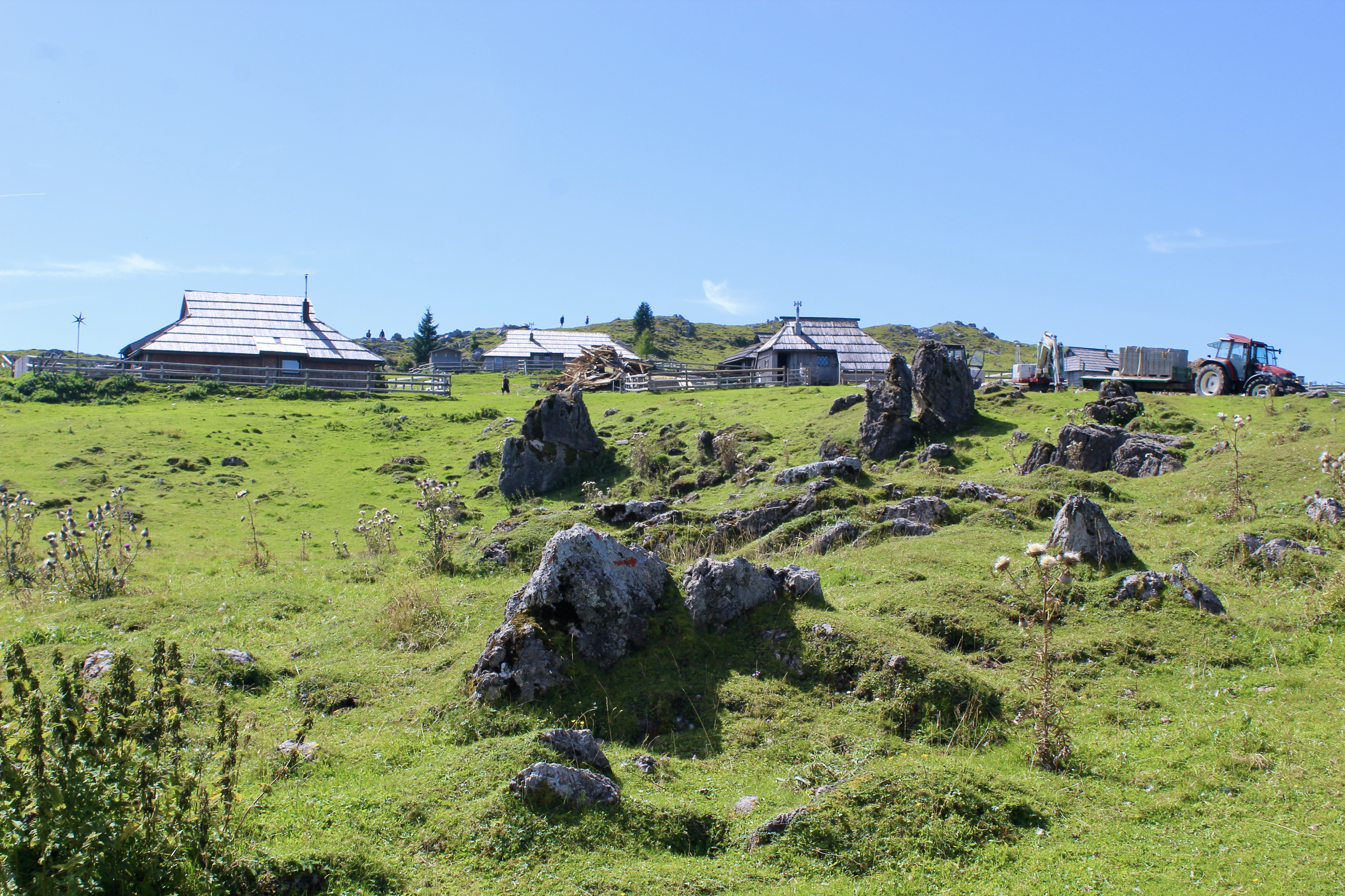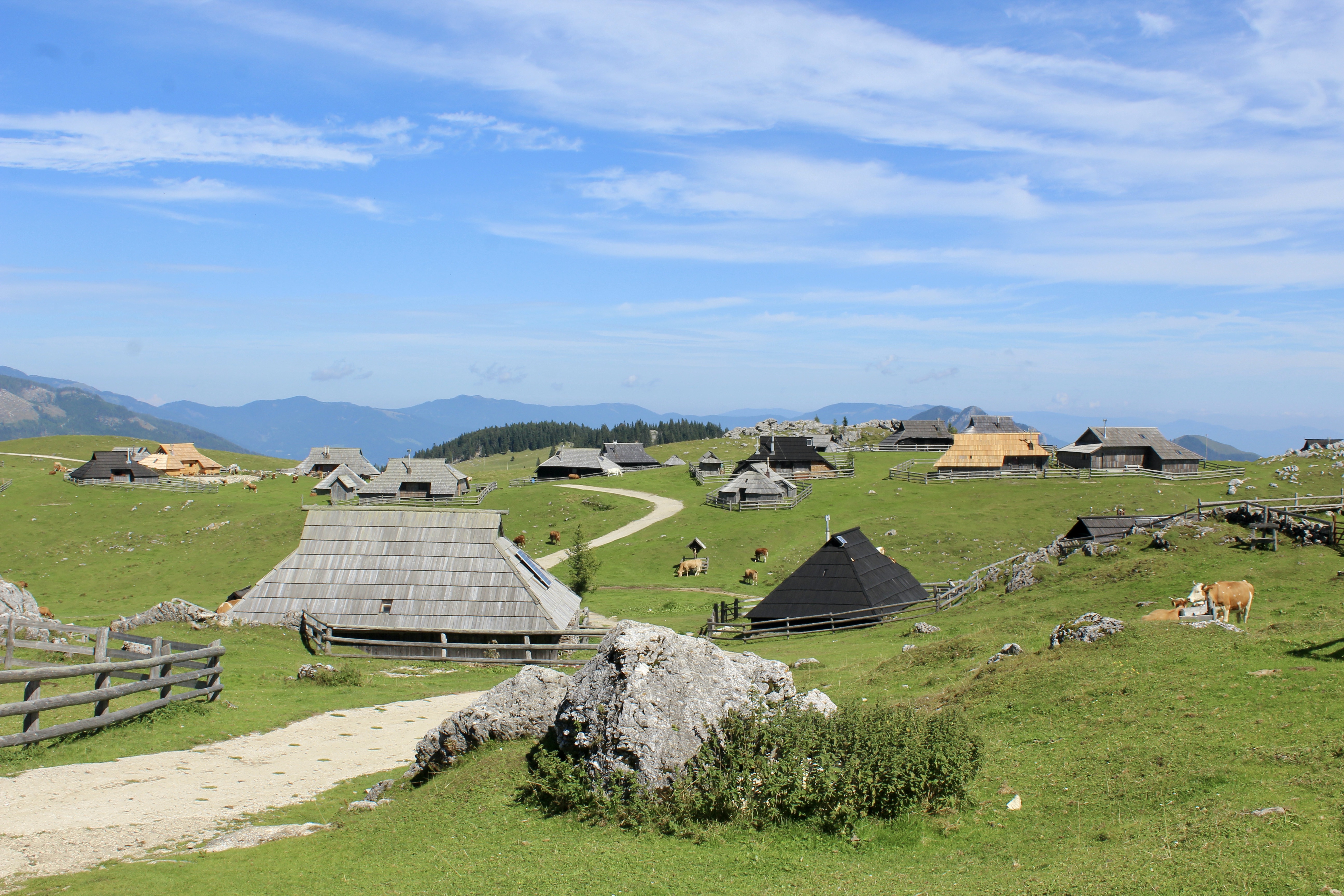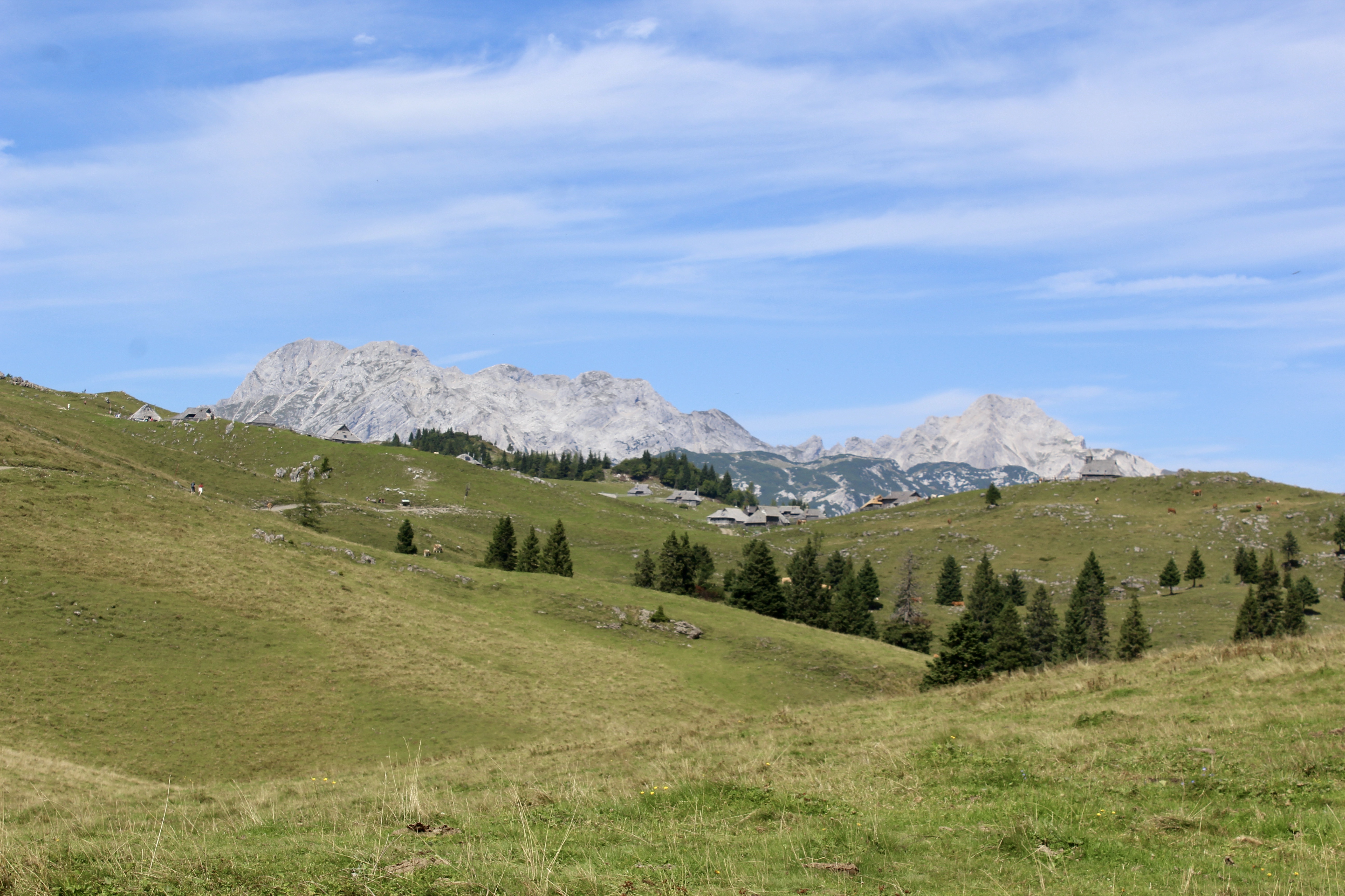 C’est un vaste plateau alpin situé dans les Alpes kamniques, surtout connu pour son ensemble unique de huttes en bois, construites par les bergers. On peut y accéder soit par une route de montagne, puis grâce à une « petite randonnée », soit grâce à un téléphérique (depuis Kamniška Bistrica). Mais ce dernier est hors service depuis quelques jours pour cause de vérifications, suite à la foudre…