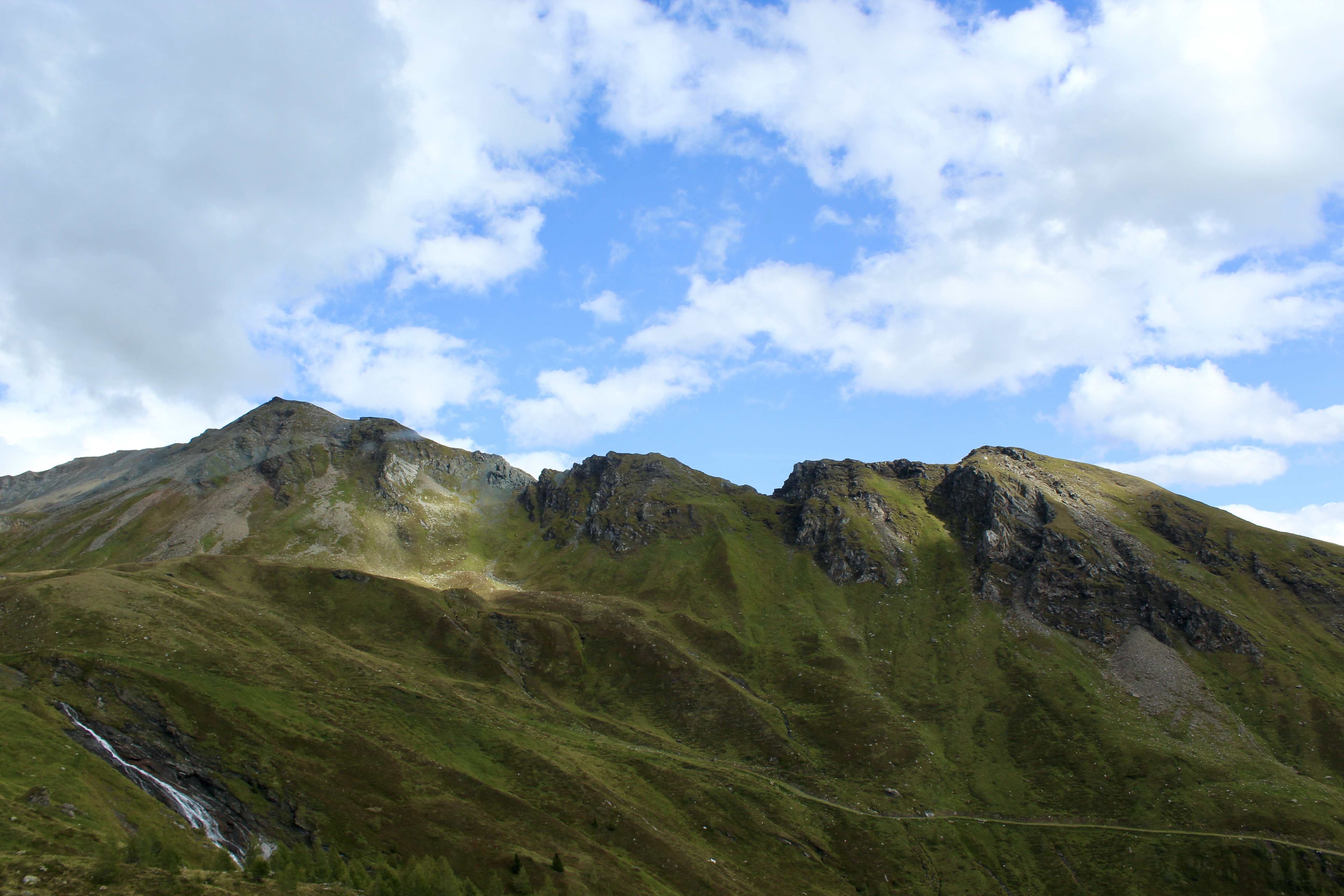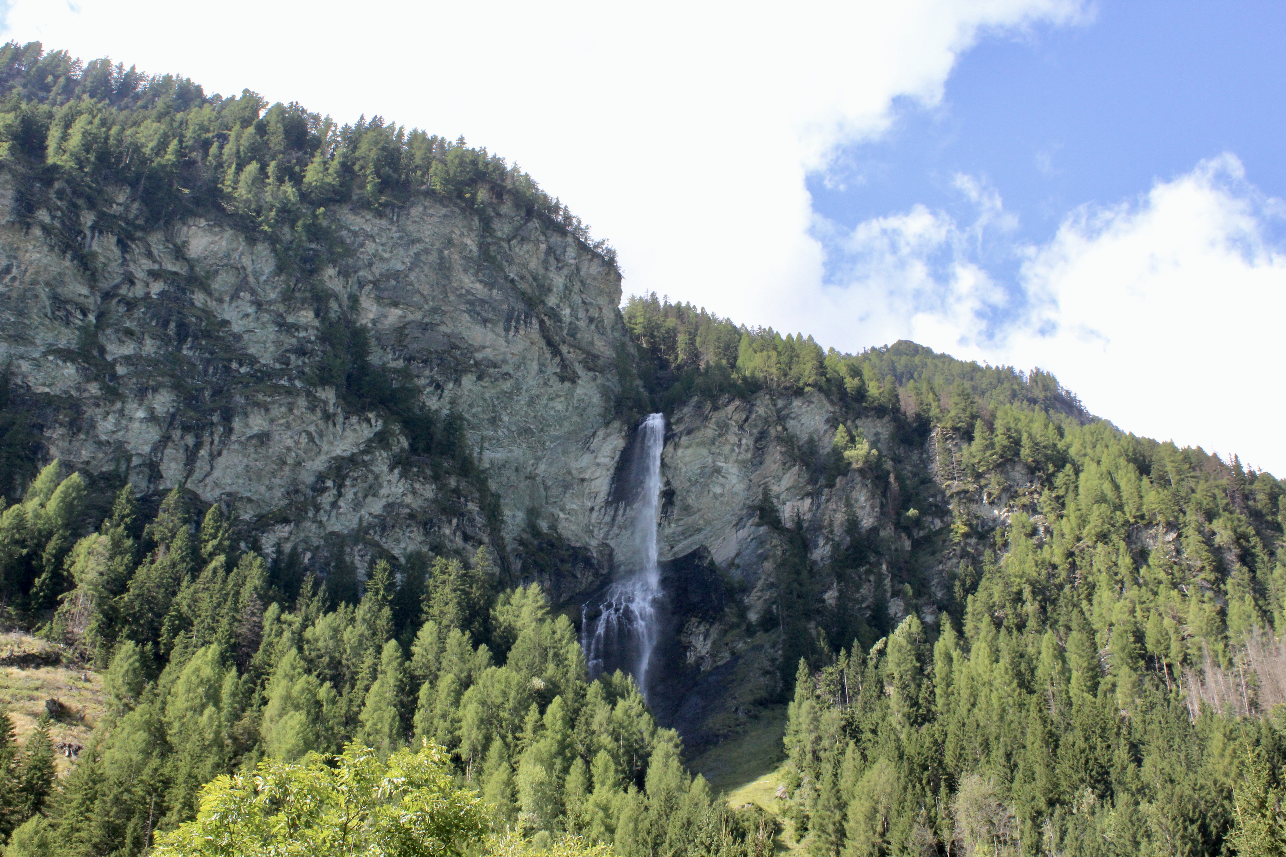 Notre paysage de croisière au début : forêt de sapins et cascades en cascade. Péage obligatoire pour accéder au col, le prix n’est pas donné, nous espérons donc que l’expérience en vaut le coup…