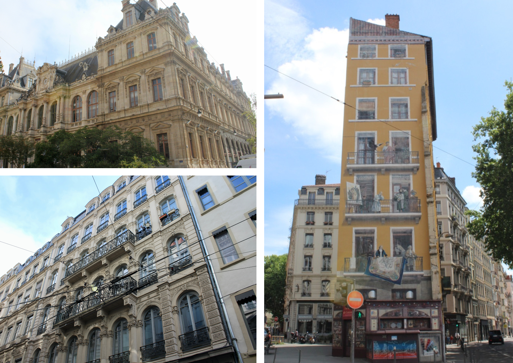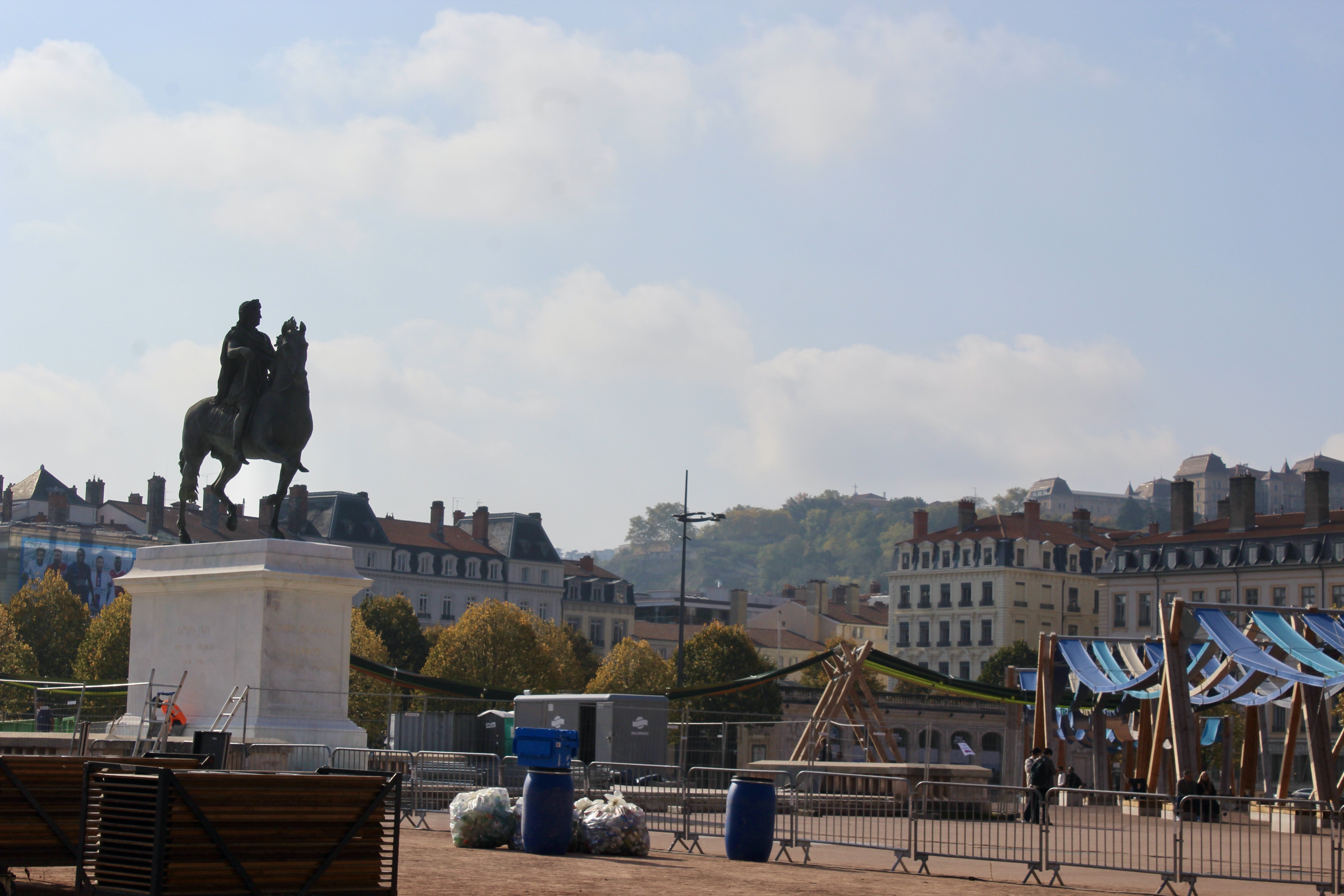 Pour atteindre la place Bellecour — le grand terrain de tennis de par sa couleur, l’une des plus grandes places piétonnes d’Europe — et son célèbre cavalier, Louis XIV (ci-dessus), différentes artères sont possibles, toutes au charme fou. En chemin : murs peints en trompe-l’œil, superbe Opéra et ses muses spectatrices, fontaine des Jacobins et la basilique Fourvière, tout derrière (que nous verrons demain)…, etc.