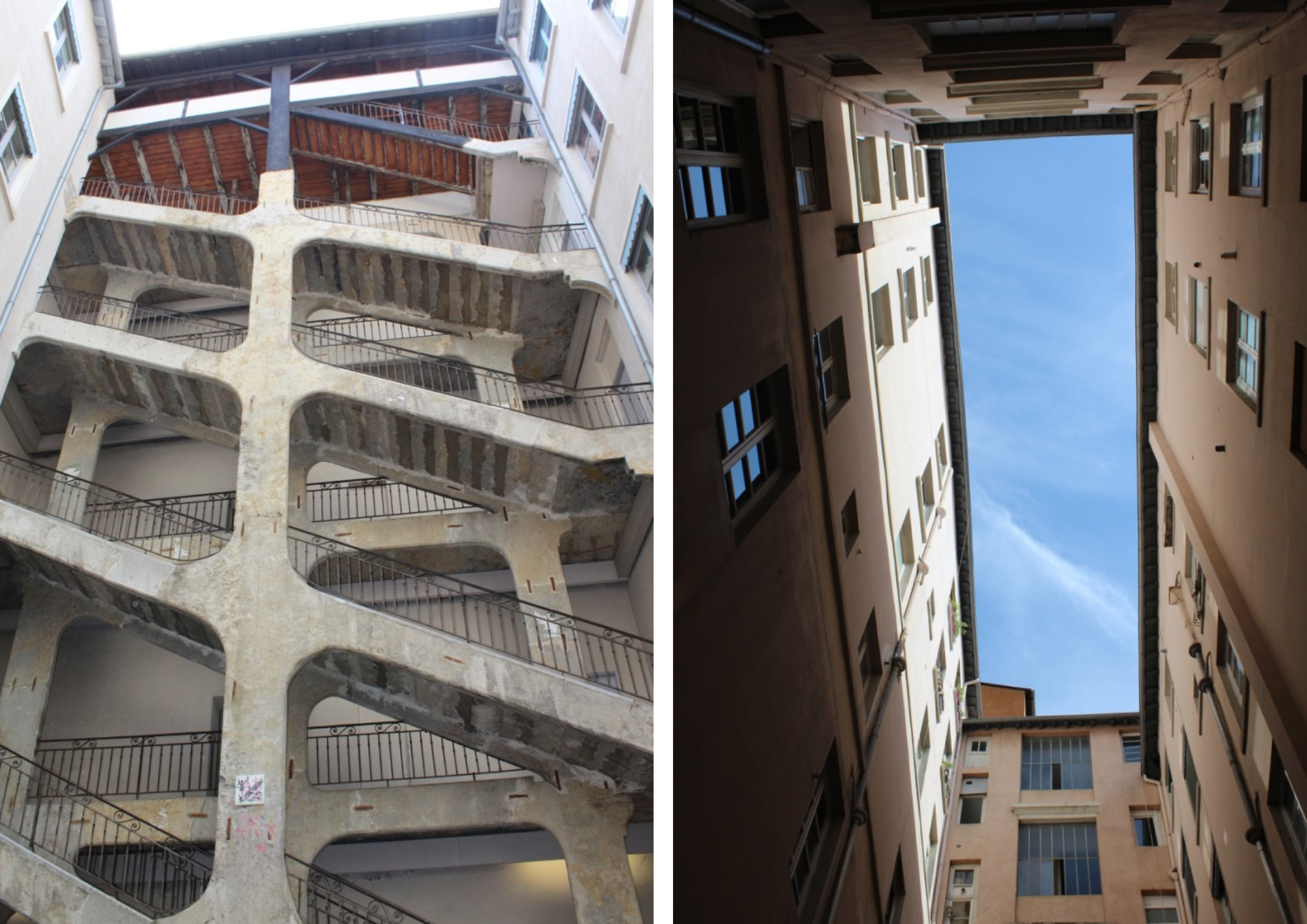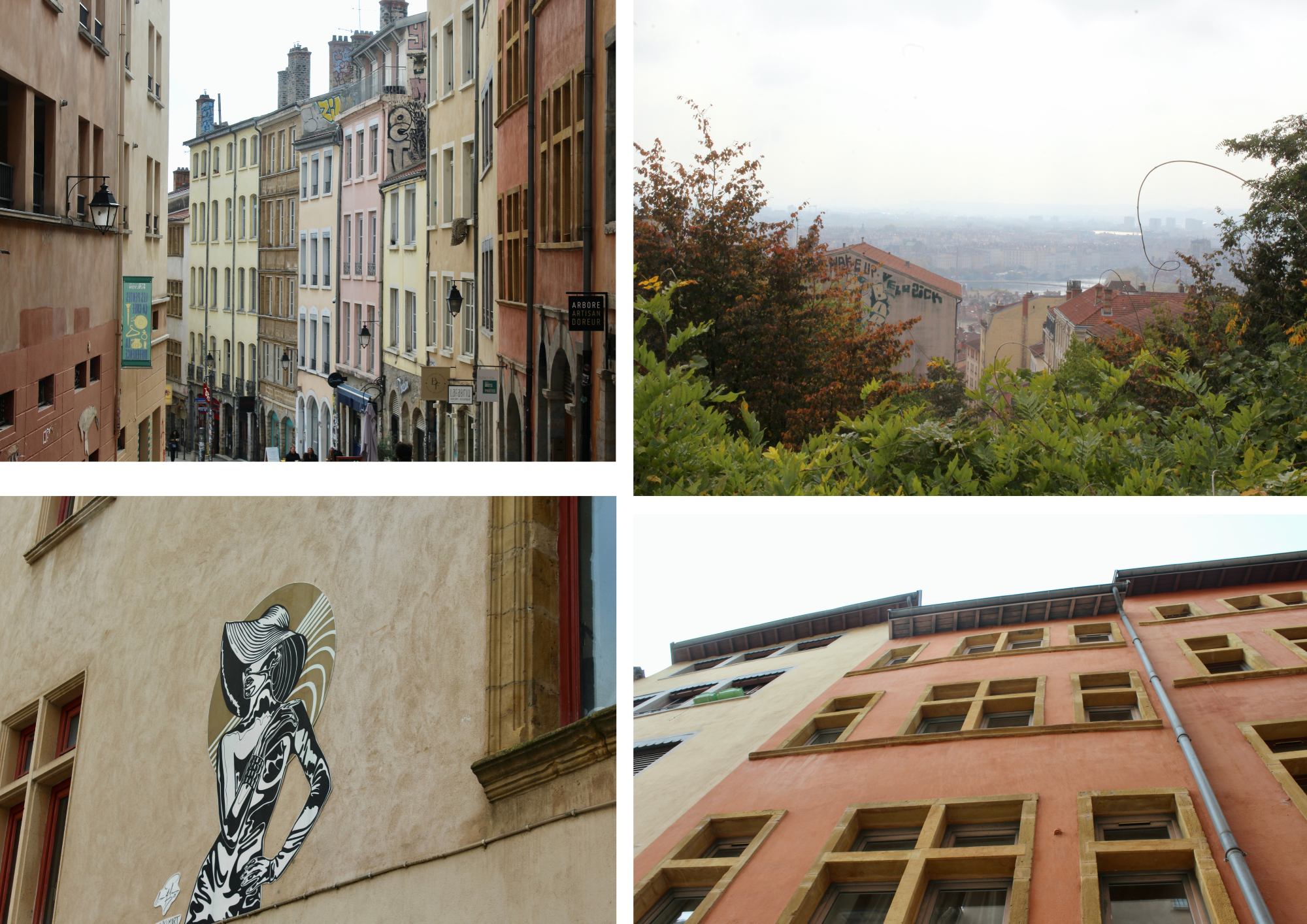 Ci-dessus donc, les pentes de la Croix-Rousse, berceau des « canuts » (les ouvriers tisserands de la soie, à Lyon, au XIXᵉ siècle). Elles racontent l’histoire ouvrière et fière de la cité. Les traboules — des passages piétons couverts typiques de ce quartier, qui permettent de traverser des immeubles et des cours intérieures pour passer d’une rue à l’autre — et les multiples escaliers cachent des trésors d’architecture, dont la célèbre Cour des Voraces, symbole des révoltes et de la solidarité des tisserands (mais pas que).